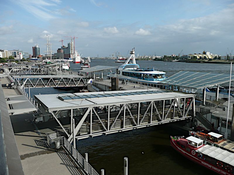 Die Hamburger Landungsbrücken mit der neuen Elbphilharmonie (Elphi) im Hintergrund